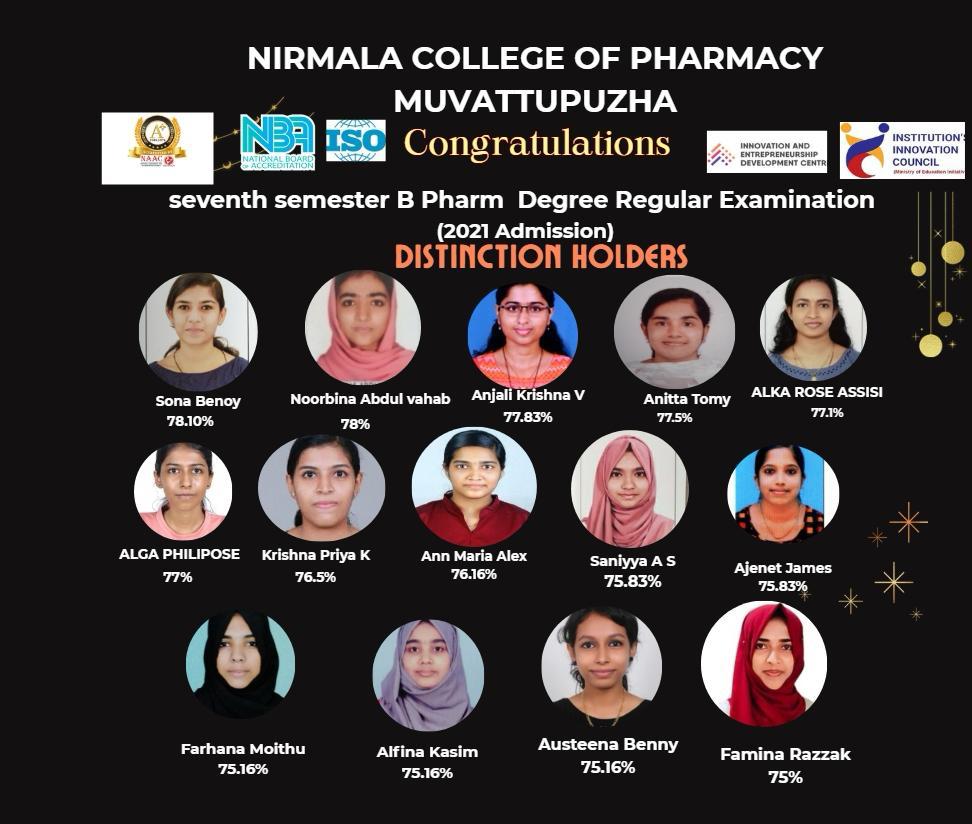 Nirmala College of Pharmacy (NCP) is yet another hallmark of the commitment and experience of the catholic diocese of Kothamangalam in the field of education. NCP is a christian minority institution established in 2004 as a memorial of the diocesian golden jubilee. It is managed by the Catholic diocese of Kothamangalam under Nirmala College Society. (Reg. No. ER.928/2001). At present the college is affiliated to Kerala University of Health Sciences, Thrissur. This college is approved by Govt. of Kerala and Pharmacy Council of India (PCI), New Delhi. The college aims at the formation of students with academic excellence coupled with integrity of character. It provides excellent infrastructural facilities with all modern amenities, a dedicated and experienced faculty with a vision to develop the institution into a full-fledged pharma-research centre. Mar George Madathikandathil, Bishop of Kothamangalam is the Patron and Rev. Dr. Msgr. Pius Malekandathil is the President. The foundation stone of the college was laid by Mar George Punnakottil, the Patron on 19th March 2004. The College was inaugurated by Sri. Vayalar Ravi, Union Cabinet Minister for Overseas Affairs on 15th March 2009. The New block of the college was blessed by Mar. George Madathikandathil, Bishop of Kothamangalam diocese and inuagurated by Sri. P.J. Joseph Honourable Minister for Water Resources on 22nd May 2015.U.G Pharmacy course is accredited by NBA till 2025